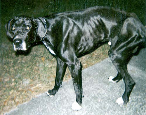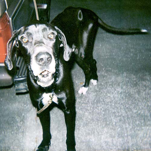Sebastian is a three year old mantle (black with white chest) dane. He has natural (uncropped) ears. He was severely emaciated (only 98 pounds) and was hit by a car, but is now recovering, and up to about 120 pounds. He is very sweet. |