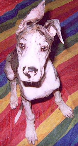Jesse is a sixteen week old blue merle male. He has cropped ears. He's the one you've seen in the newspapers. He was badly abused by his previous owners, including a broken leg. At the time of this writing, we have an appointment with the vet to look at his leg and decide on treatment. Click here to read one of the newspaper stories about Jesse and Great Dane Rescue of Tampa Bay, Inc. |
